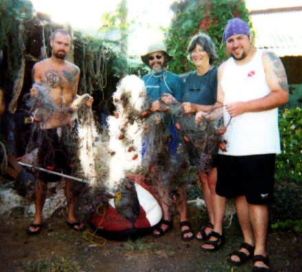 We received a report of a Ghost Net on August 17th by two of our return customers and set forth plans to recover the net the next day. It is worth mentioning that these customers (Spencer & Dave) said they never would have thought to report the net to a dive shop but because of our Ghost Net sculpture at the back of our shop they did think to tell us. Along with the help of other customers (Peter, Thad & Jonathan) we pulled out approximately 150-200 feet of net in 8-20 feet of water. Substantial damage had already occurred to the reef, but not nearly as much as would have with time.. I (Ken) was able to save one small crab. Until we get some legitimate conservation measures in place here, I know that this sort of direct action will continue to be necessary.