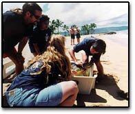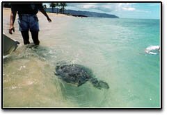 Ali'i Beach Park, North Shore Oahu Some days are indeed better than others and this was one of the good ones. After one month in captivity and fins being amputated on each turtle, Haloti and Dan were going home. Of course there is an overwhelming amount of concern for these guys because if anything happens to the other front fin they will most certainly die, but they do at least have a chance to make it. We knew that our first turtle rescue, "Chance", was alive at least ten months after losing his fin, so our hopes are not unrealistic. The releases went as planned on a beautiful sunny day with calm conditions. Both turtles swam away quite gracefully, albeit handicapped. The very popular weekly television program here in Hawaii called "Hawaiian Moving Company" was there to capture the day and produced a great story to educate more people about the plight of marine life in Hawaii. We had our boat go down for about two months after the release so we have not seen them since but we are confident that we will soon.