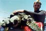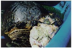 | Puaena Point, Sharks Cove and Haleiwa Harbor, Oahu On the previous day our instructor, Dan, sighted a turtle with line in his mouth and wrapping around his fin, while conducting a tour with a customer. He was unable to capture the turtle so we came back later that afternoon to find him. Upon our return we found him immediately and started stalking him. We followed him for approximately a half hour and never got closer than 5 ft from him. We decided to come back the next day, Thanksgiving Day. A group of six staff members and one customer set out early and stopped by one of our turtle cleaning stations outside the harbor. I jumped in just to check things out and sure enough I spotted a medium sized turtle "Tom" with line choking off circulation in him right front fin. I apprehended him easily as he was quite lethargic. Once on the boat I knew his fin would be amputated. Officials said it would be two hours before they could arrive so we set out for the turtle we followed the day before. Once at Sharks Cove we dove down and saw him almost immediately. Once again a pursuit ensued with myself and Chris (our dive master artist) shooting video. I had decided from the previous day that I might abandon my scuba gear so that I could follow him above from the surface with less drag. The day before had been very frustrating and I was hell bent to get him today. I knew at the least he would lose one fin if I didn't or quite possibly die. So after another exhausting half hour pursuit Chris dropped back and I ditched my gear and continued pursuit on the surface watching him 40 ft below. About 15 minutes later I saw him coming up and positioned myself above. Sure enough, after 45 minutes I grabbed hold of him, on his surface for breath, which he sorely needed. A tremendous relief came over me. I named him "Gonzales" as in Speedy. Once back in the harbor we turned over the turtles. Shortly after, a large turtle with tumors and fishing line swam by the dock. I jumped in and got him. Unfortunately he was blind in one eye and nearly so in the other (thus his name "Keller" i.e. Helen Keller), sadly we believe he will not make it. All in all, it was an amazingly up and down day. Our biggest hope is that by our efforts, others will become more aware and help us change things for the better.